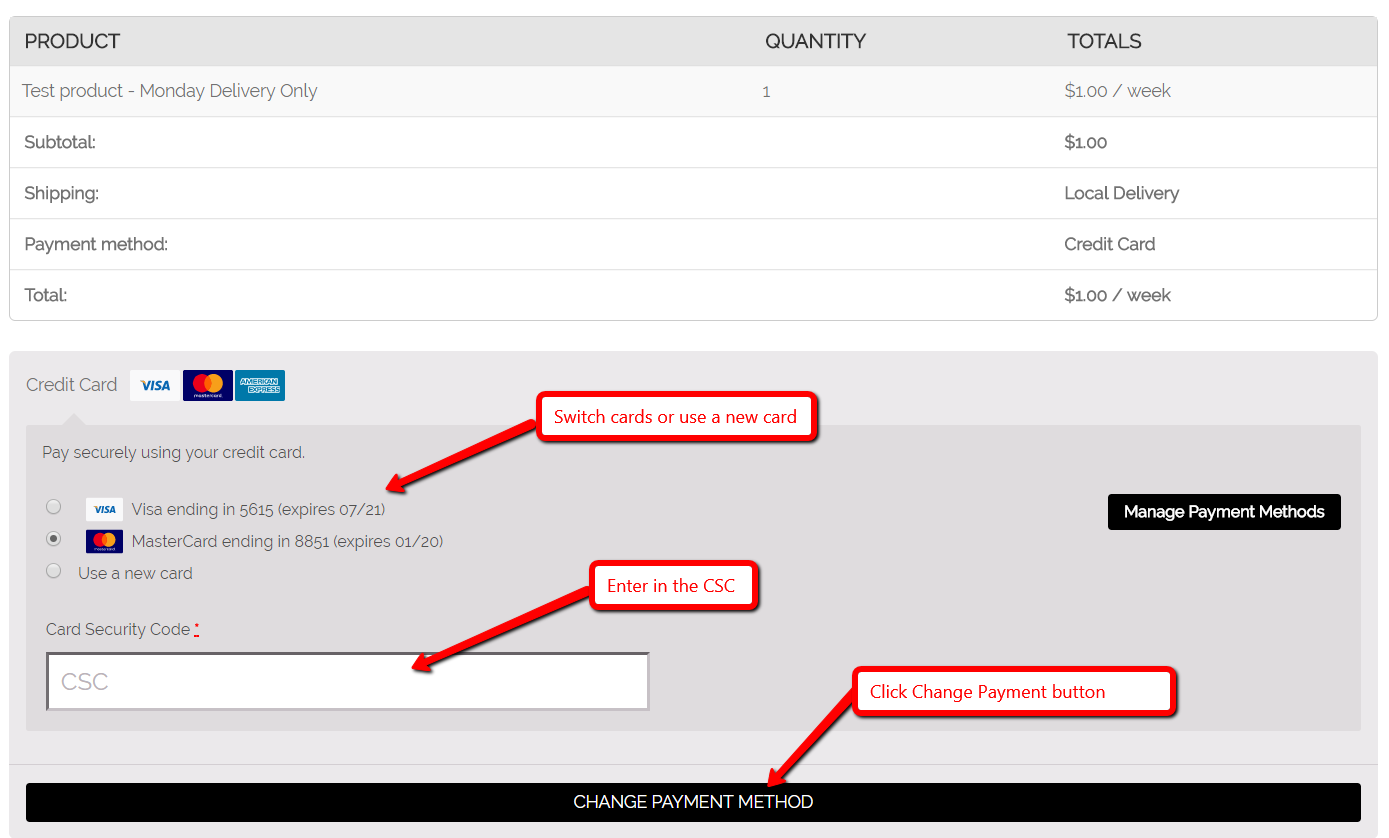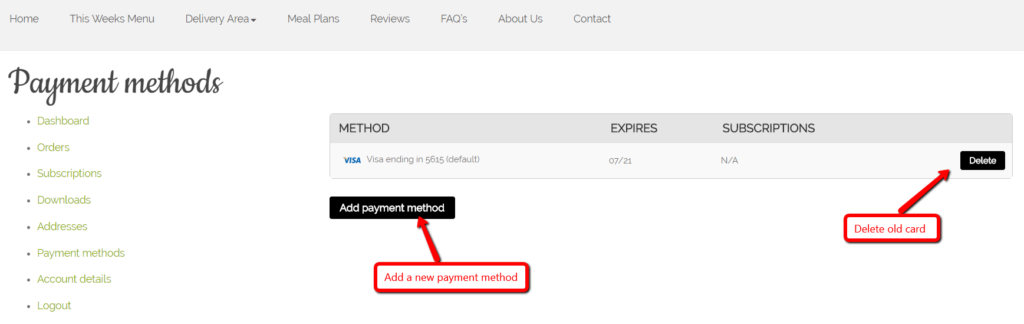 Updating credit cards in your account is useful when you lose a card, a card expires, or you simply wish to have a different card on file. IMPORTANT NOTE: If you add a new card to the payment methods it does NOT automatically set it as the card for the subscription. See the next FAQ on how to associate a new card with your Meal Plan.